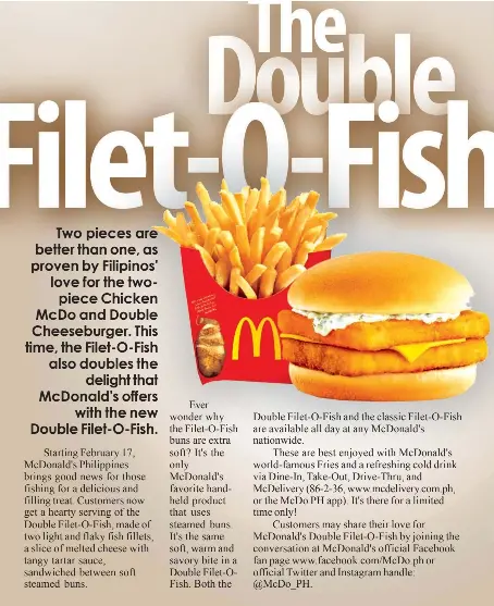 McDonald's Menu 2 for $5 is Back Again【2021 Deals & Offers】 Like every other competitor, McDonald's also offers a wide range of coupons, deals, and special offers. Mcdonald's 2 for $5 is one such special deal you would never regret buying. Let us get into the details of it. ... Filet-O-Fish: The ingredients used in the Filet-O-Fish are the regular bun, fish filet patty, tartar sauce, and half-sliced ...